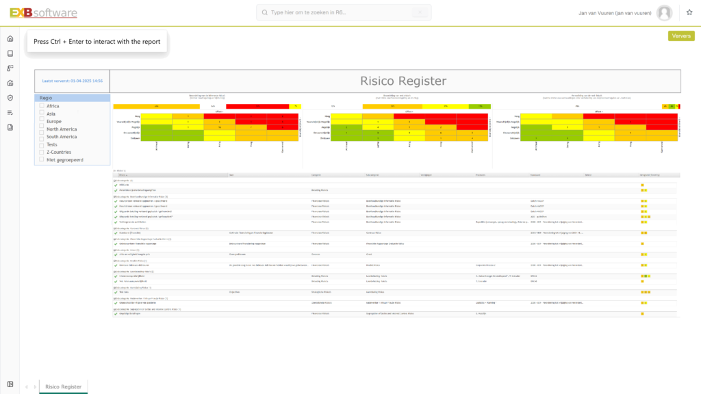 EXB Software ondersteunt jou als Risicomanager bij het organiseren, uitvoeren en aantonen van effectief risicomanagement. Je krijgt overzicht, samenhang en realtime inzicht, zodat risico’s beheersbaar worden en de organisatie aantoonbaar in control is.